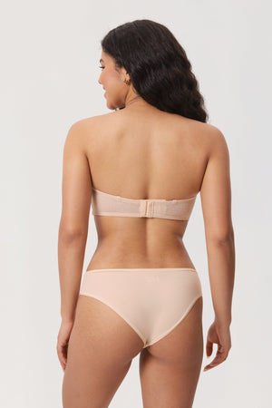 Feel effortlessly romantic in our Nude and Pink Lace Demi-Cup Strapless Bra. This stunning bra features a full lace overlay, underwired demi-cups, offering a flattering shape and reliable support.
