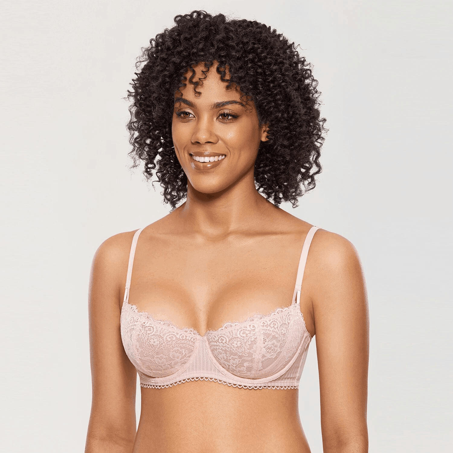 Designed for curves, this lace push-up underwire bra blends romantic style with everyday support. Ideal for plus size purple bras and nude options alike, its molded demi cups, plunge neckline and adjustable straps create a lifted, rounded shape that flatters every outfit.