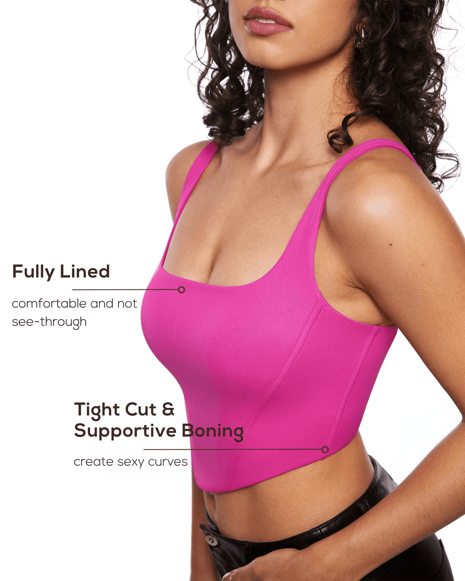 Front view of pink corset-style longline bra top with square neckline and wide straps - MissFine