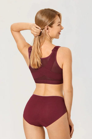 Back view of burgundy racerback bra with wide supportive band and posture panel seams - MissFine