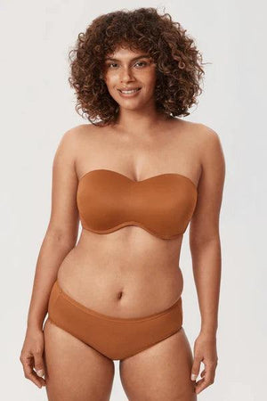 This full cup strapless bra gives smooth, stay-put support for fuller busts in flattering nude and bronze tones. Seamless molded cups, underwire shaping, and a wide band create a secure, invisible foundation under dresses, tops, and occasion outfits.