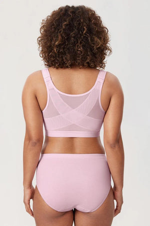 Designed for curves, this full figure front closure bras style zips on from the front so you never struggle with back hooks. Lightly padded, molded cups, wide straps, and an X-shaped back panel combine for everyday smoothing, support, and posture-friendly comfort.