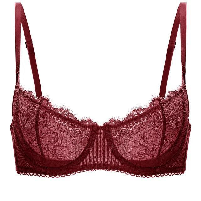Side angle of burgundy lace push-up balconette bra showing molded cups and underwire - MissFine