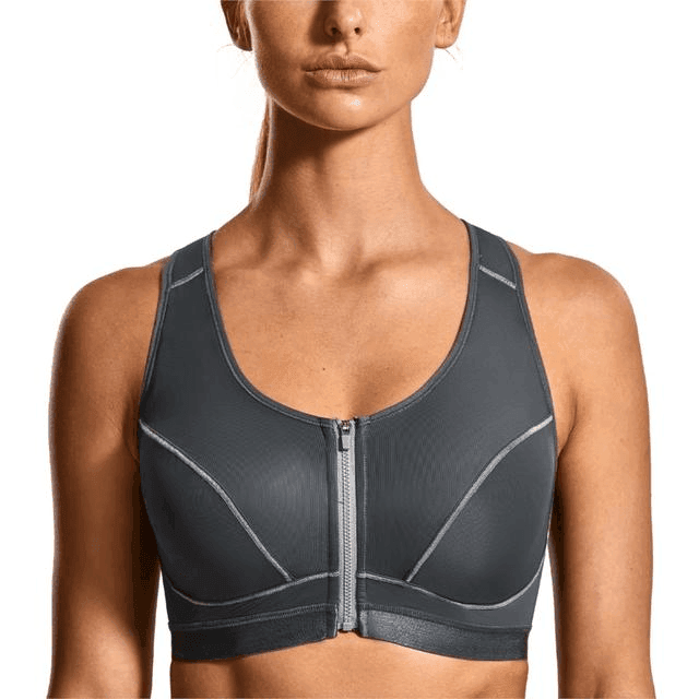 • Front zipper closure and racerback straps make on-and-off easy while maintaining full-coverage support.