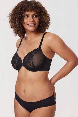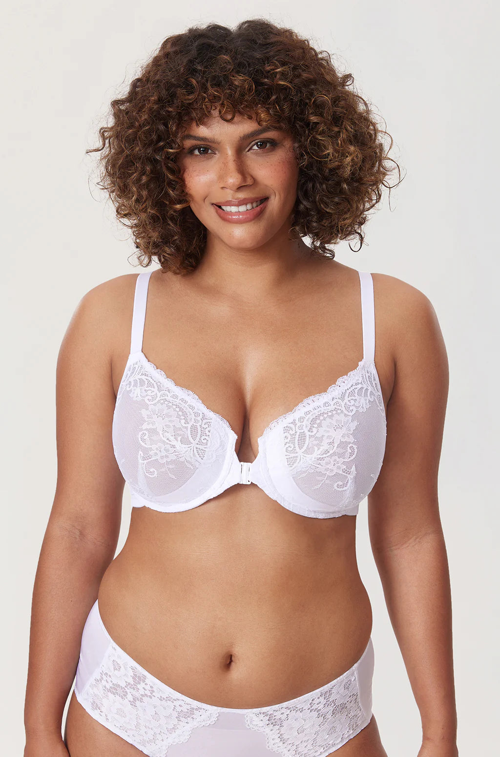 Discover a seamless bra with support that combines front-closure ease with flattering plunge shaping. Molded cups, soft lace, and a smoothing back band provide secure lift, beautiful cleavage, and everyday comfort in band sizes 34–48 and cups B–F.